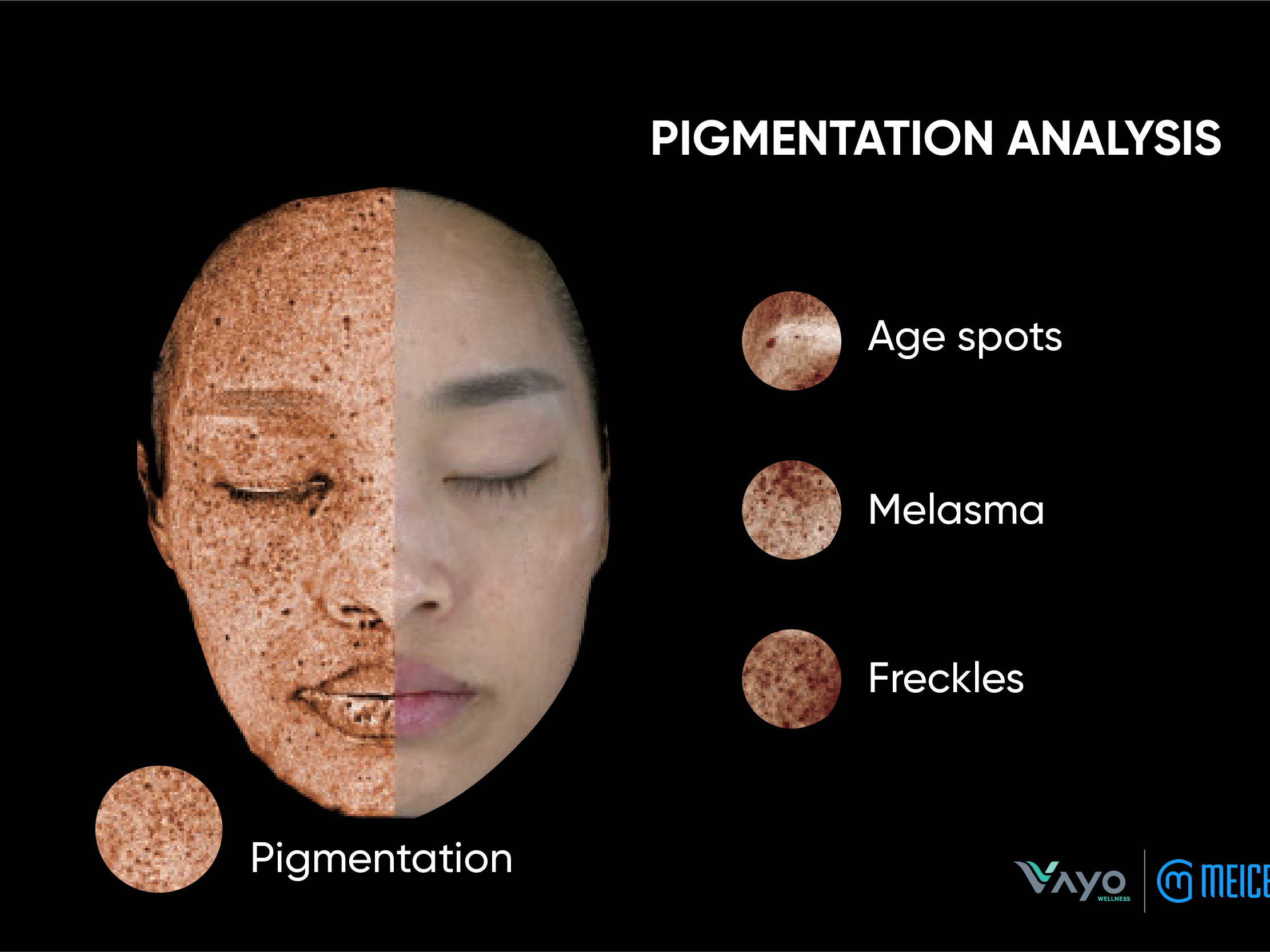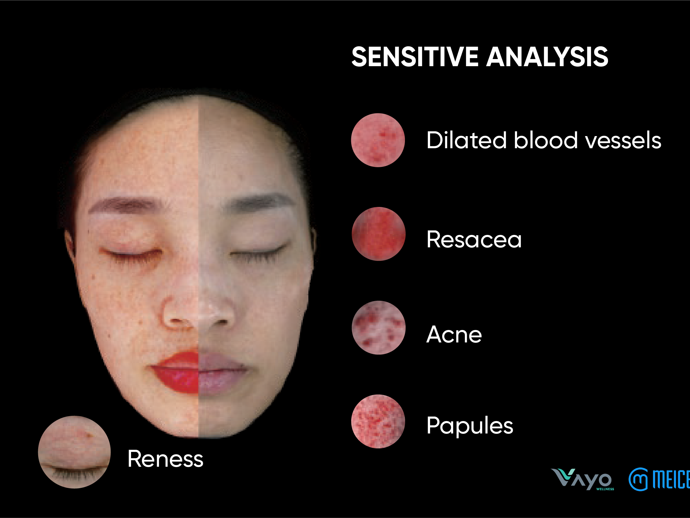 - สามารถวิเคราะห์ ผิวบอบบาง, จุดด่างดำรอยไหม้จาก UV, รูขุมขนกว้าง, สีผิวที่ไม่สม่ำเสมอ,
